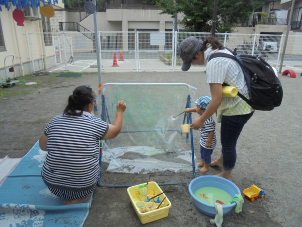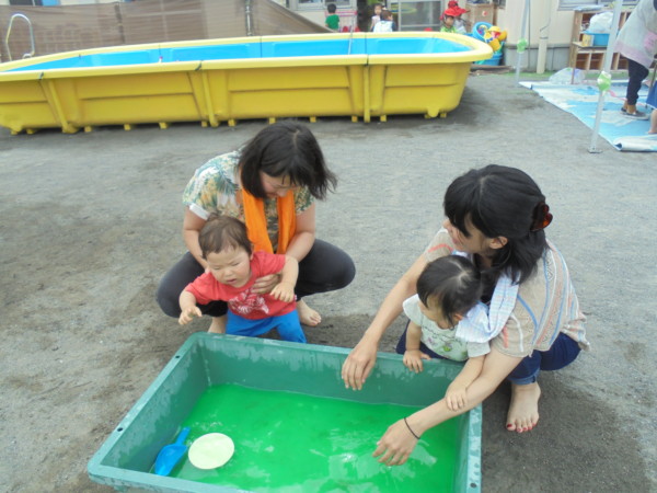 毛糸の流しそうめんコーナーや入浴剤を入れた水遊びコーナー、自由にお絵描きが出来るペイントコーナーなどたくさんの遊びを体験しました!「気持ちいい♪」と話すお友だちも多く、水の感触だけでなく色・匂いでも楽しみ、夢中になって遊びましたよ。