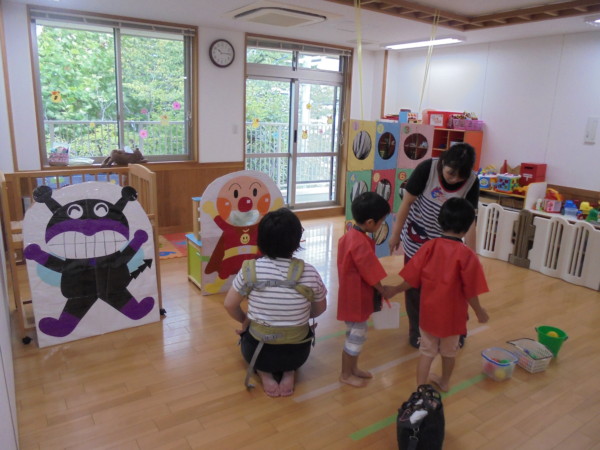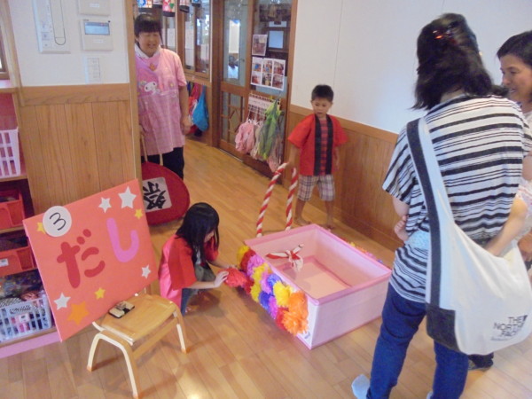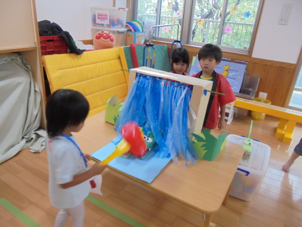 夏祭りでは写真撮影、山車、ワニワニパニック、ストラックアウト、くじ引きのコーナーがあり、色々な遊びを体験しました。年長組のおみこしや店番が更にお祭りの雰囲気を醸し出し、皆さん笑顔で楽しむ姿が見られましたよ。