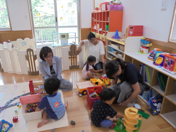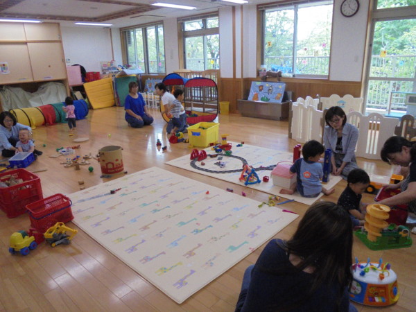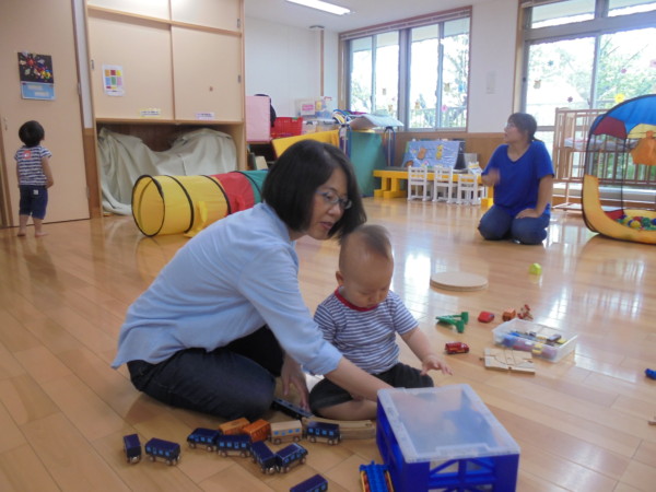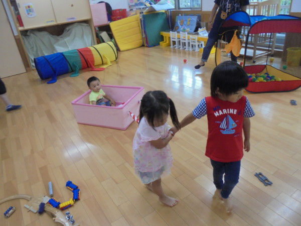 今日はホールでゆったりと遊びました。車やおままごとなど楽しそうに遊んでいました。「どうぞー!」とお友達やお母さんに料理をごちそうしている子もいましたよ。夏祭りで使用する山車に乗ると「ばいばーい」と嬉しそうに手を振ってくれました。「やるー!!」と力持ちのお友達が引っ張ていましたよ。当日も楽しみにしていてくださいね☆
