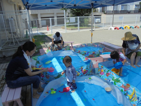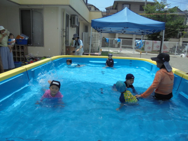 プールでは、小さいお友だちはビニールプールに入り、おもちゃで遊んだり水の感触を楽しみましたよ。ニコニコ笑顔がとても可愛く楽しさが伝わってきました♡大きいお友だちは幼児用プールでたくさん泳いで遊びました。バタ足に挑戦してみたりと泳ぎが上手になってきましたよ!また遊びに来てくださいね。