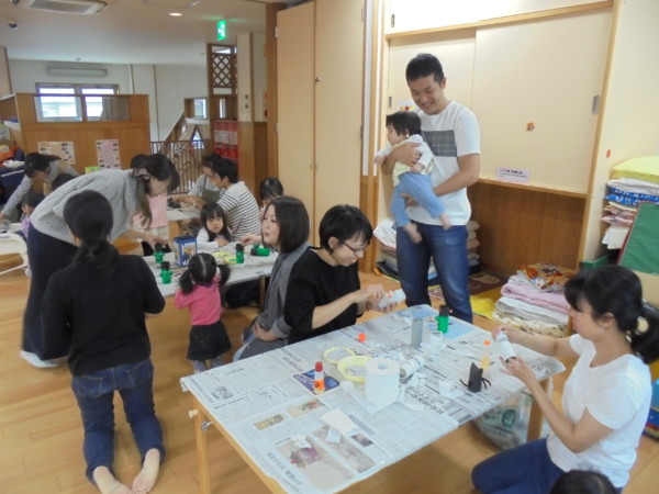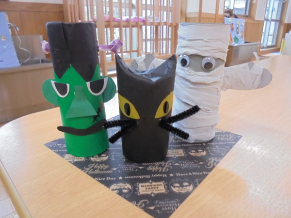 月末はハロウィンですね☆今日の制作では、トイレットペーパーの芯で黒ネコ、フランケン、ミイラ男を作りました。お父さんお母さんと一緒に作り、完成すると嬉しそうでしたよ!ぜひ、お家でも飾ってハロウィンを楽しんでくださいね☆今月お誕生日のお友だちはいませんでしたが、アヒルのダンスを踊ったり、紙芝居を見たりと楽しく過ごしました♪