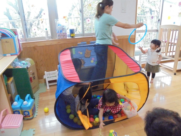 今日は木曜園舎開放の日でした。ホールでは折り畳みテントの中でボールを投げたり、トンネルをくぐったりと楽しそうに遊んでいましたよ。お気に入りの玩具を出して、楽しんでいるお友だちもいました。台風がまた近づいてきていますね。気を付けて週末をお過ごしください。
