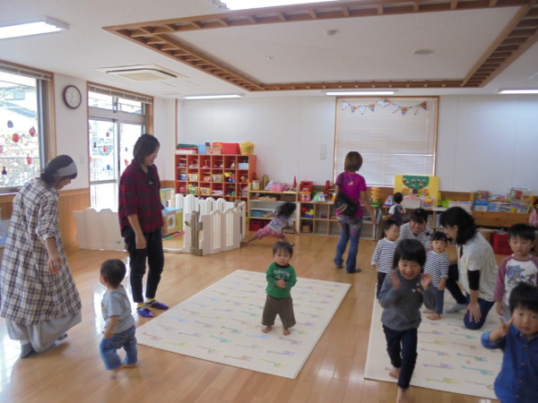 秋晴れの過ごしやすい日でしたね。今日は2階ホールを開放しました。お友だちやお母さんと一緒に楽しそうに遊んでいましたよ。お気に入りの玩具でたくさん遊べた様子でした。帰りはみんなで手を繋いで丸くなり、「さよなら あんころもち また きなこ」と上手に歌っていました。また遊びに来てくださいね!!