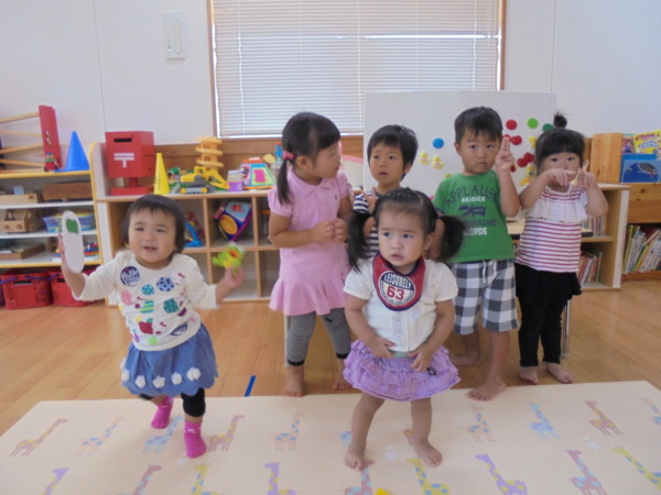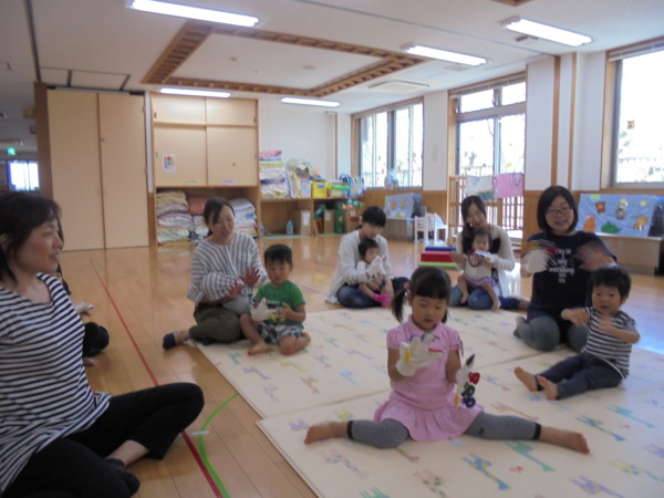 今日も元気いっぱいのお友だちが遊びに来てくれました。ホールではニコニコ笑顔で遊んでいましたよ!“ゆびにんじゃ”が始まると、手袋をはめて楽しそうに参加してくれました。真剣な表情で指を動かしている子もいましたよ☆今週の土曜日は運動会です。地域のお友だちが参加できる競技もあるので、是非遊びに来てくださいね!!