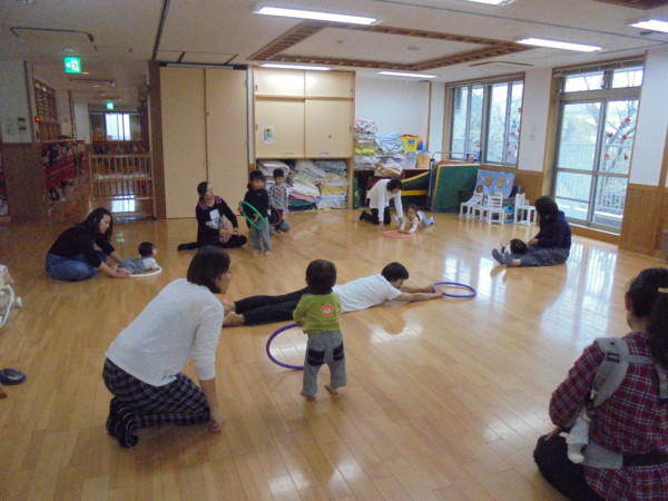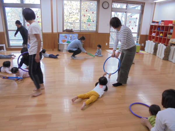 音楽に合わせて身体を動かしたり、フラフープを使った体操などをし、楽しい時間となりました♪お子さんがフラフープを持ち、保護者の方が引っ張る動きではスーパーマンになったかのように背筋良く満面の笑顔を見せてくれましたよ。