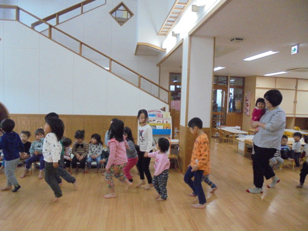 久しぶりのリズム!みんな楽しみにしてくれていましたね。さくら組さんにリードされ、お母さんから離れて、リズムに参加する姿は、なんだかひと回りもふた回りもたくましくなっています。