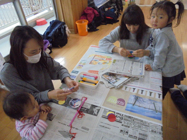 今日はおひなさま作りをしました。紐の上に丸い紙、花びら、おひなさま、おだいりさまを貼りました。お友だちはマスキングテープを貼ったり、シールをペタペタ。型抜きのハンコであっちにペタ、こっちにペタと色々な形を作りました。とても集中していました。世界に一つのかわいい吊るし雛が完成しましたよ!!