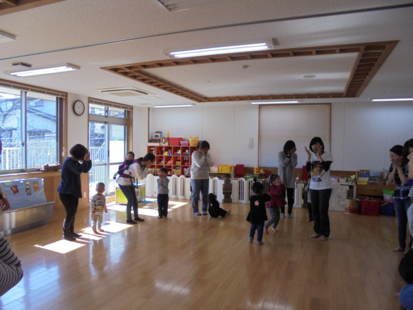 今日は はる先生の親子体操の日!ホールはお友だちでいっぱいです。お母さんと手をつないでニコニコ笑顔!すっかり動きも分かって、足の上でバランスをとったり、ポーズをとったり、夢中で楽しんでいます。パラバルーンではルールを教えて頂き、大きく膨らんだバルーンの上に乗ったり楽しい時間を過ごしました。次回は3月8日(金)です。たくさんの参加をお待ちしています!