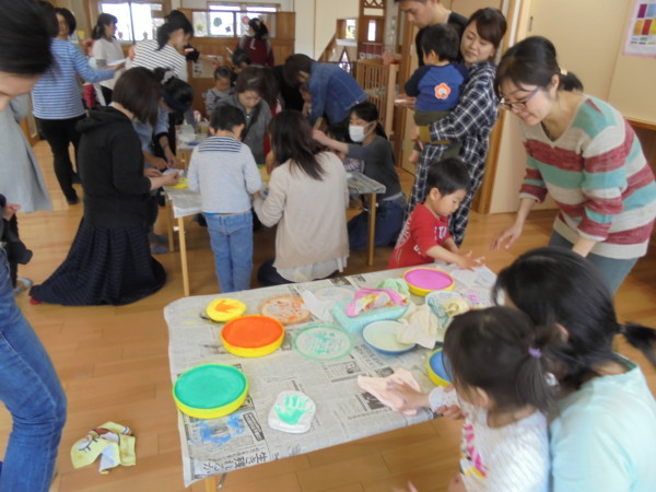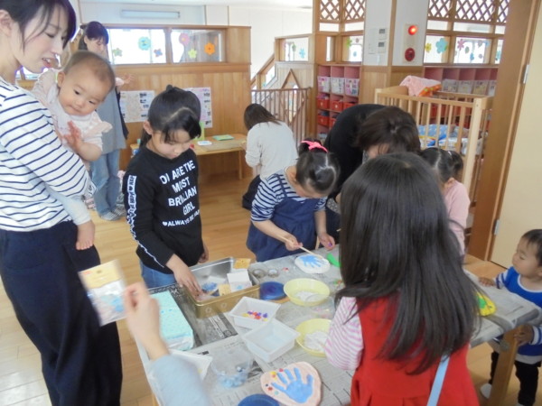 今日は手型のプレート作り。かわいい手をパッと広げて粘土にペッタン!まわりにはビーズの飾り!世界に一つの宝物が出来上がりました。1ヶ月位、棚でお休みします。少しの間、お待ちくださいね!