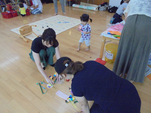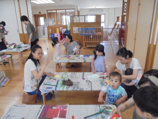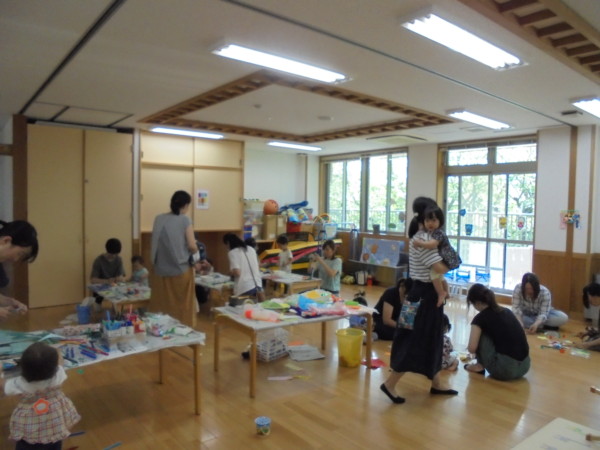 今日は七夕飾りを作りました!小さなお友だちが多いので、自由描き・シール貼り等子どもの参加の部分とママが制作する部分に分けました。お友だちも頑張りましたが、今日の一番の「頑張り屋さん」はママです☆本当にご苦労様でした。短冊に書いたお母様の願い事がどうぞ叶いますように!!
