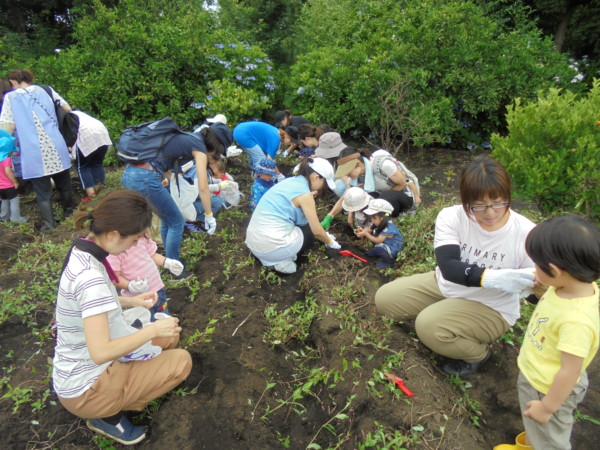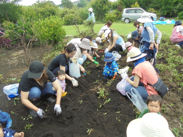 じゃがいも掘り出来ました☆今日のお天気がはっきりしなかった為、昨日から何遍も天気予報とにらめっこ!ママ達も同じ気持ちだったのではないでしょうか?みんなが畑にいる時は風もあり、過ごしやすかったですね。一生懸命掘ってくれたので、ゴロゴロお芋さんと沢山会うことが出来ました。「ここにもあるよ!」「おいもだぁ♡」と嬉しそうな声が聞こえてきました。今日の夕飯はカレーかな?ポテトサラダかな?じゃがいも掘りのお話が夕飯のおかずになるかもしれませんね☆今日はご参加ありがとうございました!!