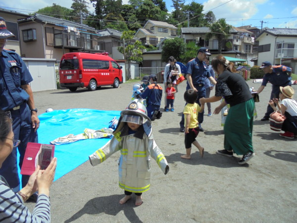 9時30分から保育園児と消防署との合同防災訓練がありました。始まりが早かったにも関わらず、沢山の地域のお友だちの参加をいただきありがとうございました。阿久和キッズ、つばき保育園も参加し、防災やいざという時の心構え等、心がけたいお話ばかりで、「参加して良かった!」との声が多く聞かれました。「そんなにお水を用意しなくてはいけないのね。」「備蓄ね!」等、お母さま方も話しされる姿も見られましたよ。最後は地震や火事の時の避難に有効なダンゴ虫のポーズ、わにさんのポーズ等を教わり、練習しました。