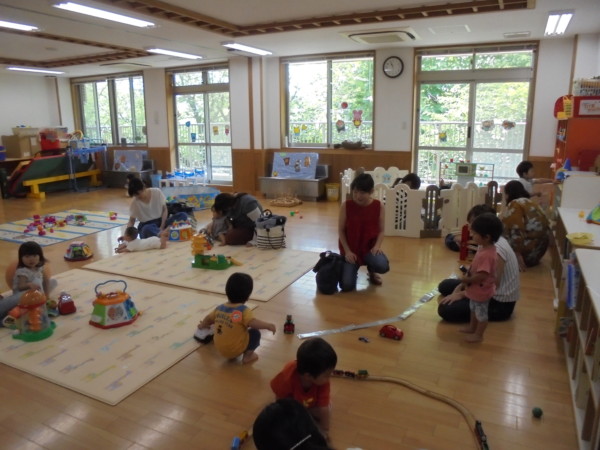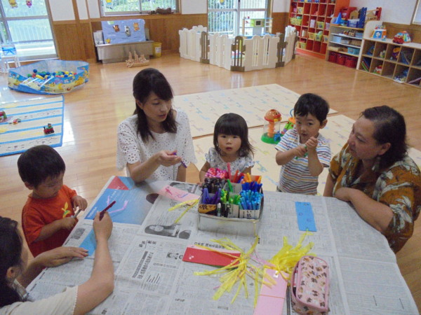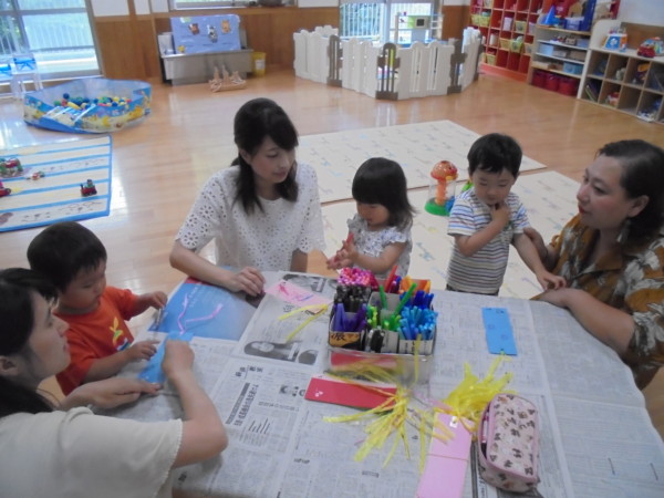 多目的ホ-ルは小さなお友だちが多くなりました。ちょっと大きなお友だちは異年齢交流の中で色々なことを学び、お兄さん・お姉さんになっていきます。成長が楽しみですね♡今日は明日作る七夕飾りの前哨戦!短冊を作りました☆ペンでの自由描きの上にお母様のお願い事が輝いていました。明日は雨が降りませんように!!てるてる坊主を作って飾りますね。
