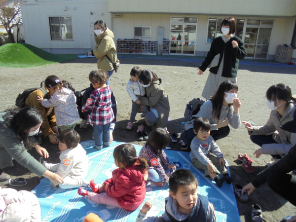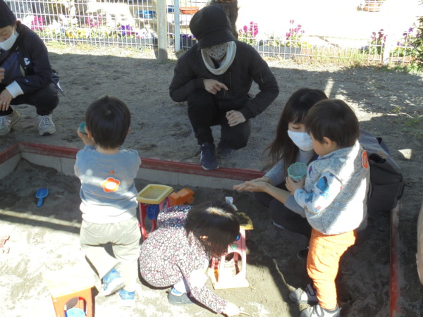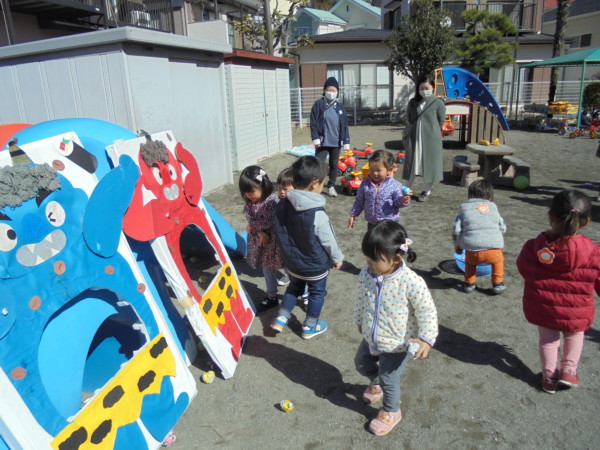 今日の火曜園庭開放は…ちょっと遅い節分です!!鬼に手作りボールを投げて遊んだり、ボールを集めて「ゴミ収集車みたい!!」と、はしゃぐ元気な子ども達の声が聞こえていました♪砂場では園長先生がお母様方とお話をしていました。少しの時間ですが、育児のヒントを集めて下さいね☆