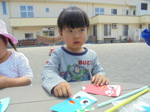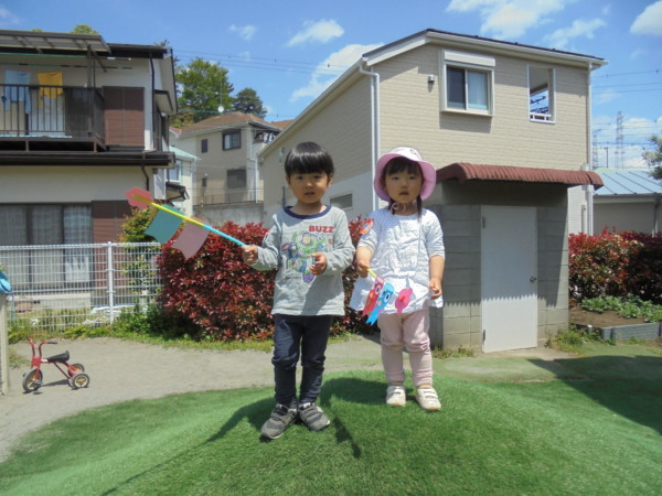 過ごしやすい一日となった今日は、2組のお友達が遊びに来てくれました!久しぶりに遊びに来てくれたお友だちは、背が高くなりお兄さんになっていました!!保育園デビューのお友だちは2か月の可愛い女の子!!これからたくさん遊びましょう♪先週に引き続きこいのぼりを作りました。風が吹いて飛んで行ってしまった時にはビックリしましたね。芝山でも記念写真☆ミ “みんなこいのぼりに負けないぐらい大きくなーれ!!” 次回は5月11日(火)です。また遊びに来てね!