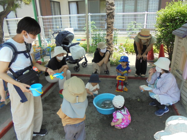 園庭にはたくさんのお友だちが遊びに来てくれました!ピカピカ太陽の下、どろんこ遊びのはじまりはじまり~!!初めてのどろんこにビックリするお友だち!お空にはシャボン玉も飛んでいてとってもキレイでした☆