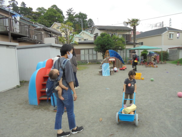 今日のお天気は時々雨がポツポツ。地域のお友だちが来る頃には雨が止まって、