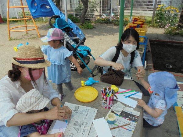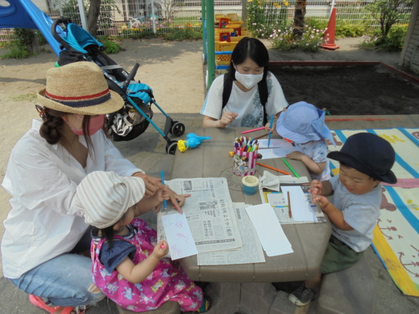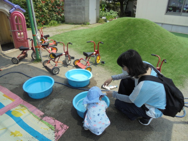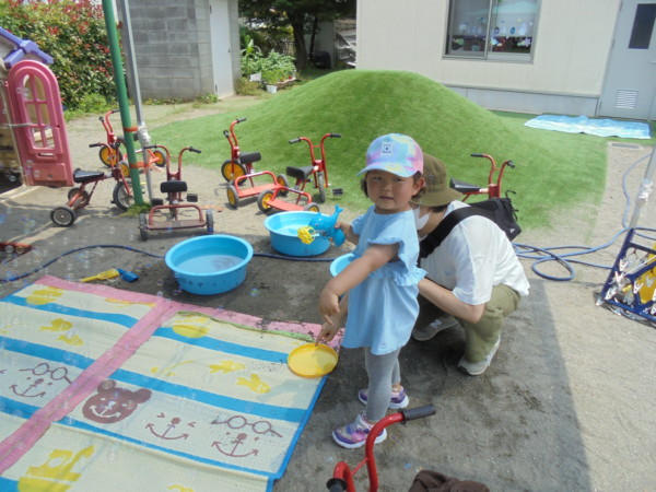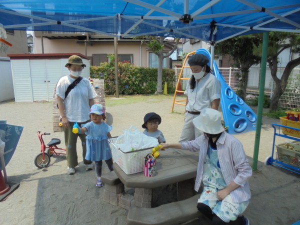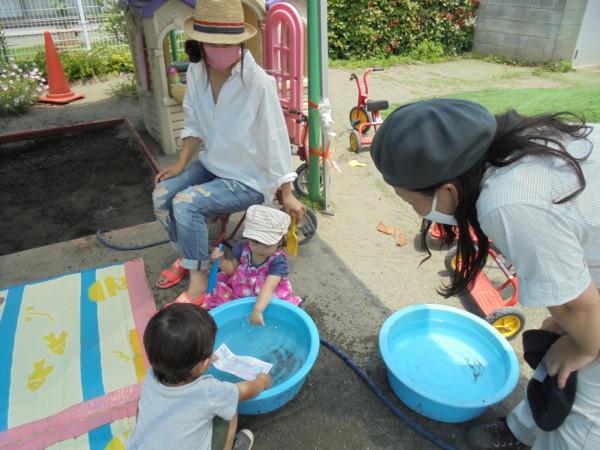 今日もとても暑い火曜園庭開放になりましたが、お砂場の前に青いテントを張ったので涼しげでなんだか違う場所に来たようでした。今日は遊びのバイキング!  ・シャボン玉・お洗濯・どろんこ遊び・にじみ絵、盛りだくさんにいろいろな遊びをしました。冷たいお水はとても気持ちがよく、にじみ絵は思い思いの模様が出来ました。汚れてもよい服装で遊びに来てね。