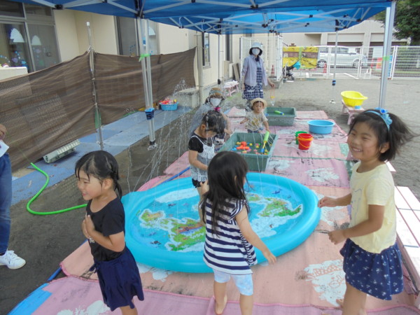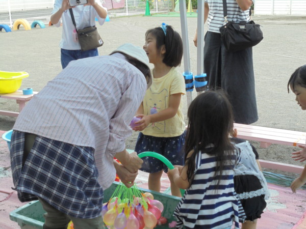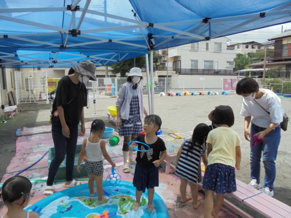 夏休みになり火曜園庭開放には幼稚園に行っているお友だちも参加してくれて、とても賑やかな園庭開放となりました!!お水が下から飛び出てくるプールでは、子ども達大喜び!!!最後には全身ずぶぬれです♪他にも水風船にシャボン玉。。。水遊びは楽しいですね♪みんなの笑顔がキラキラしていました☆来週もまた遊びましょう♡
