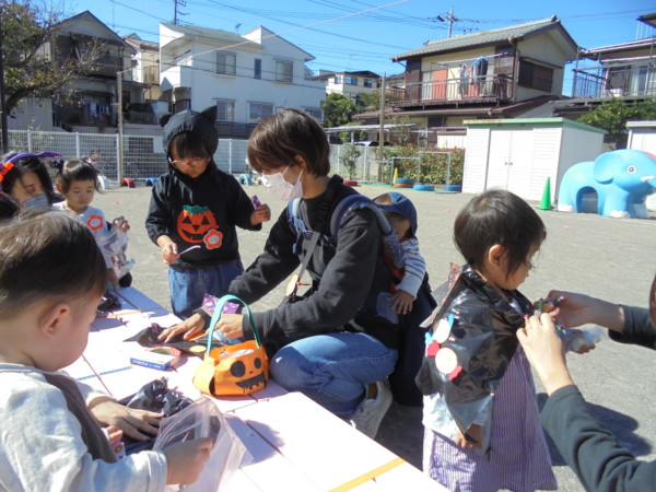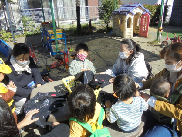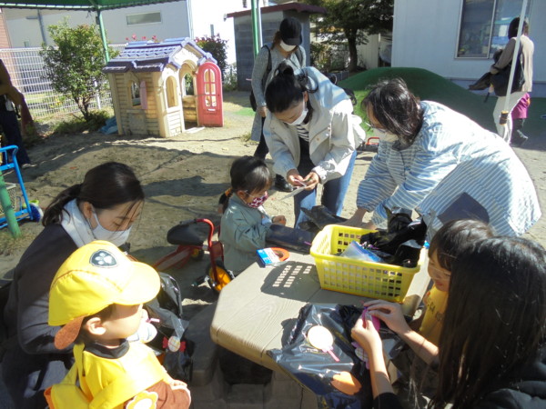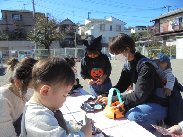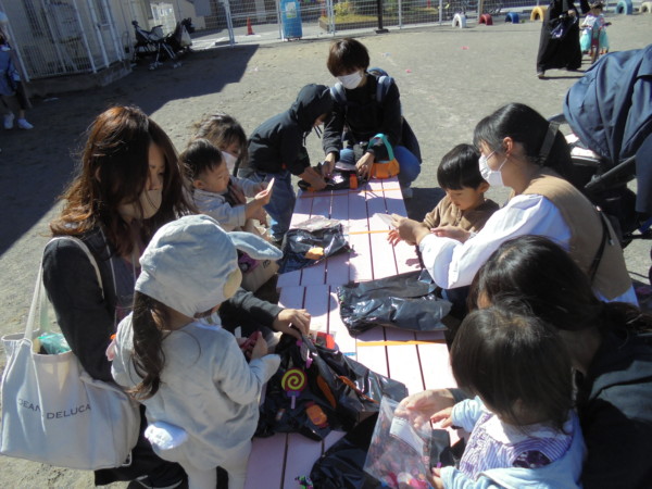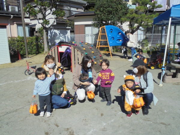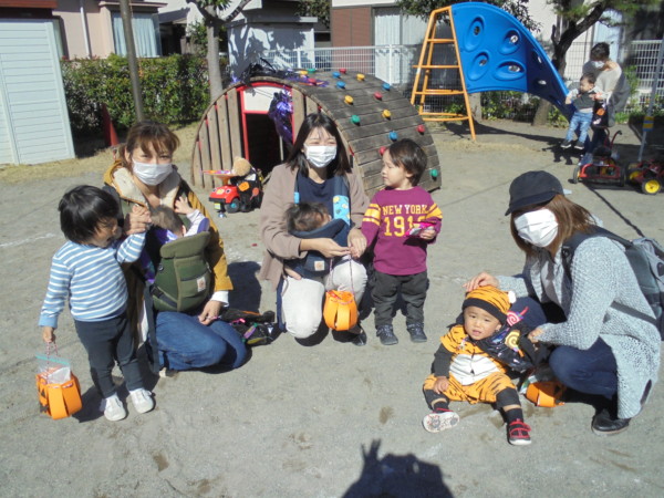 園庭がお友だちでいっぱいです。手作りマントを付けて、手遊び‼かぼちゃ、リズムに合わせて自然に体が動いています♬ゴザの上にもしっかり座れるようになりお兄さんお姉さんです💛