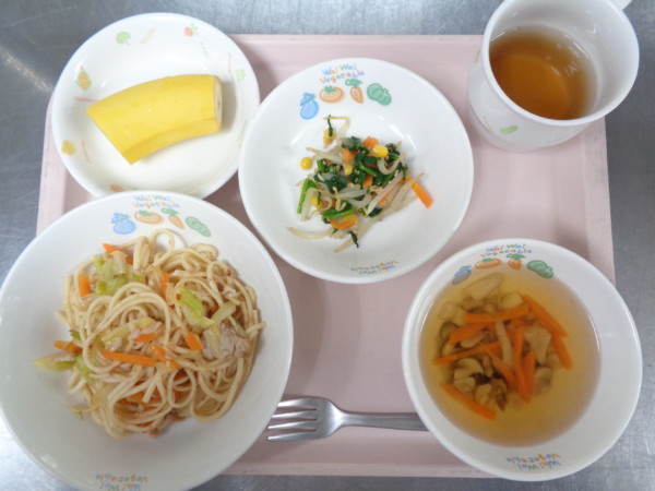焼きうどん、中華スープ、青菜の胡麻和え、バナナ・・・283kcal