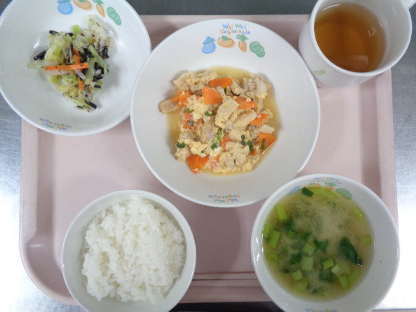 ごはん、味噌汁、高野豆腐のふわふわ煮、ひじきサラダ・・・411kcal