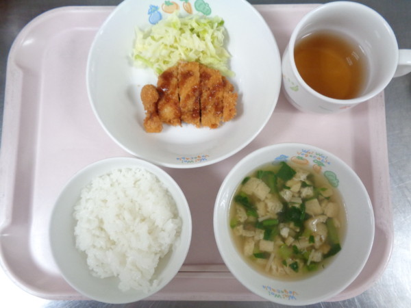 ご飯、飯きつねスープ、チキンフライ、茹でキャベツ・・・379kcal