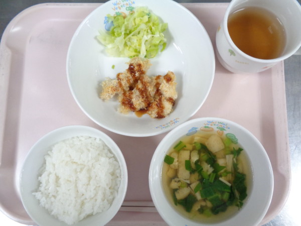ご飯、きつねスープ、チキンフライ、茹でキャベツ・・・379kcal