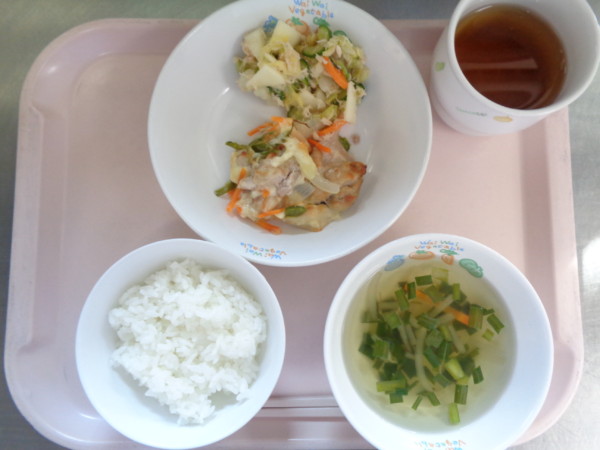 ごはん、春雨スープ、鶏のチーズ焼き、白菜とりんごのサラダ・・・417kcal