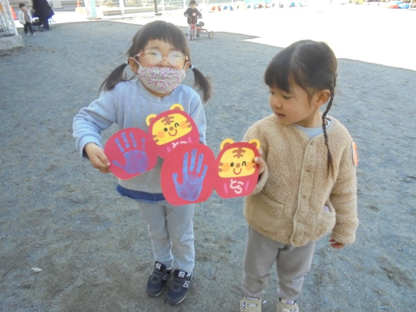 太陽がお友達。ぽかぽか陽気に体を動かしたお友達は元気いっぱいです。長い縄の登場に子ども達ならではの遊びが生まれていました。とっても楽しそう!!ニコニコ笑顔がはじけていました。「トラの手型」は足りなくなるほど盛況で、出来なかったお友達は来週用意しておくね♪お楽しみは「おべんとうバス絵本・バナナ君体操」みんな覚えてね☆来週も仲よく遊びましょう!