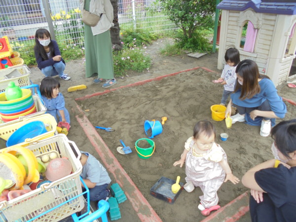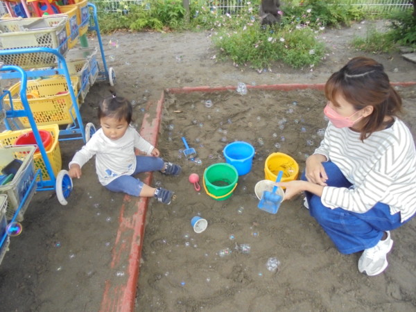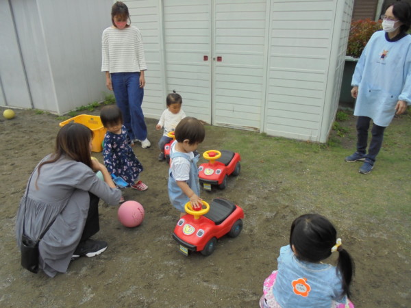 そんな中でも阿久和保育園の園庭は地域のお友達の元気声が聞こえています。カエルのシャボン玉に笑顔、笑顔!!お砂場はシャボン玉でいっぱいです。ゾウさんの滑り台でハイポーズ。ブービーカーでは中にお砂を入れたり、立派な運転手さん。背中がピーンと伸びています。ボールだってできるようになったよ!自然と足が出てキックキックもできました。かわいいね♡