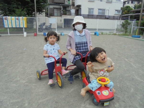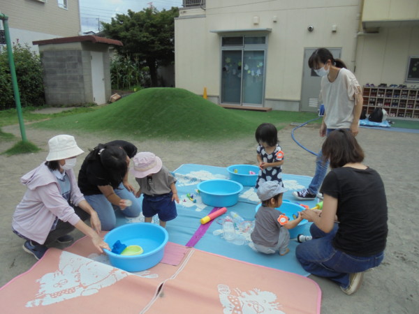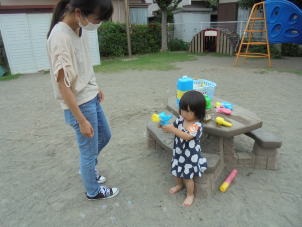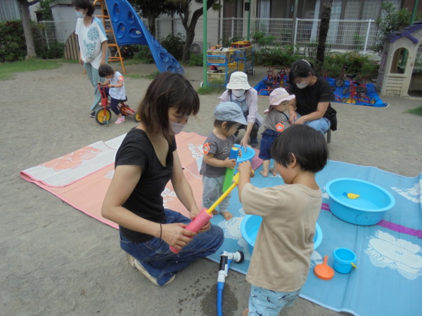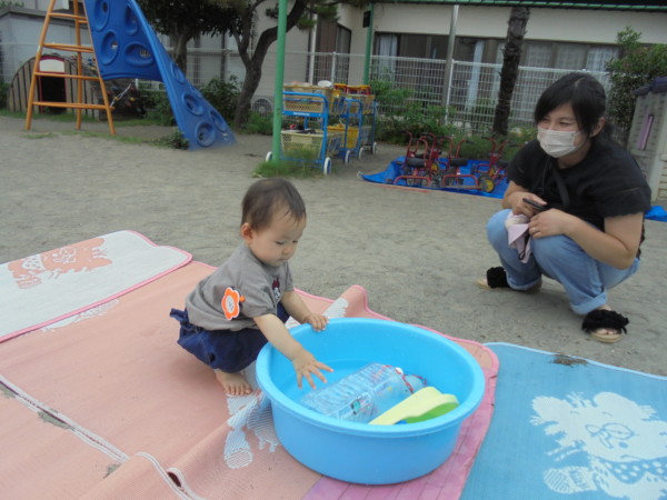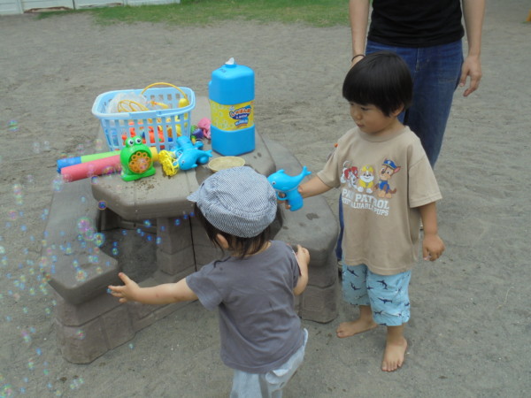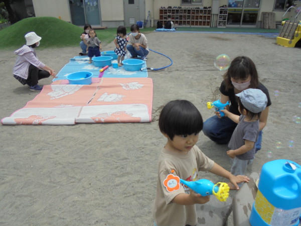 雨が時々ぱらつく天気。保育園の上空に雨雲が出たり入ったり、とても心配でしたが、どうにか遊ぶことが出来ました。お水あそび、シャボン玉遊び、水鉄砲だってできるようになり、思い思いのおもちゃで遊び、最後はお片付け。芝山にお洗濯したおもちゃを運んで乾かしてくれました。とっても上手にできました。ありがとう!