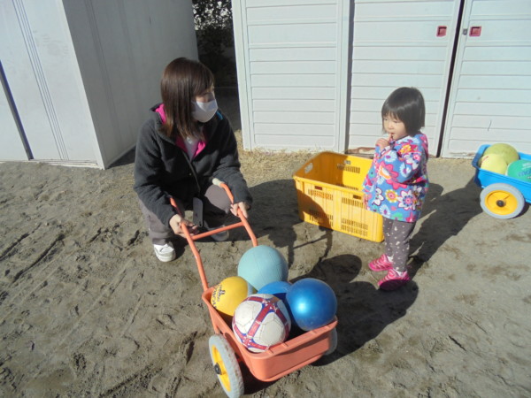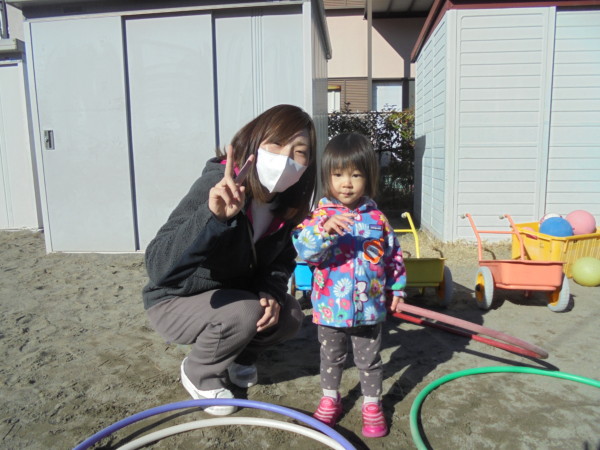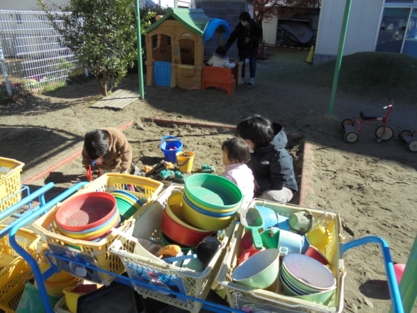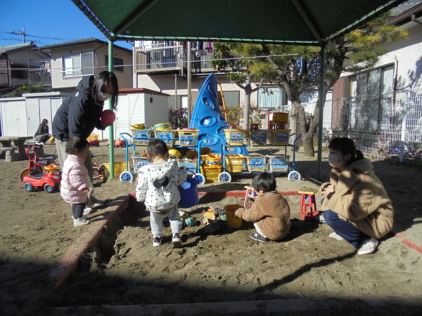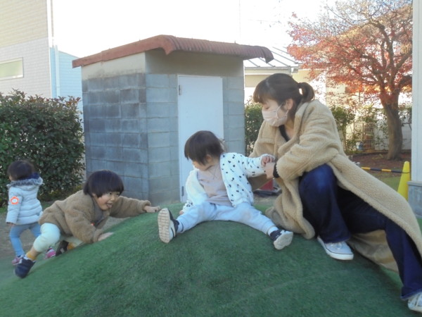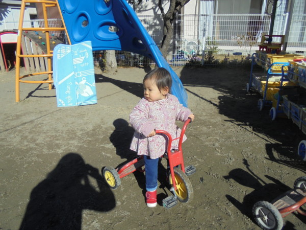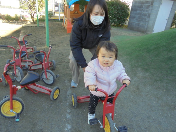 今日は、久しぶりに地域のお友だちに会うことが出来ました。三輪車に乗ったり、お砂場、芝山の子どもたちの様子に、つい私たちの方が笑顔になってしまいます。みんな可愛いですね!