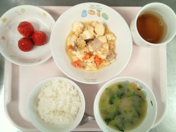ご飯、味噌汁、いり豆腐、いちご・・・390kcal