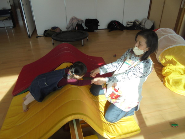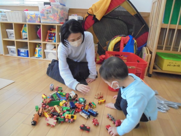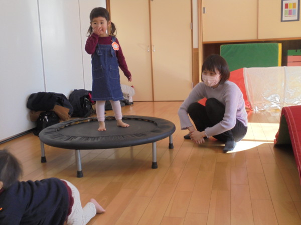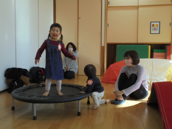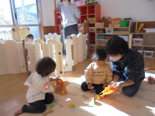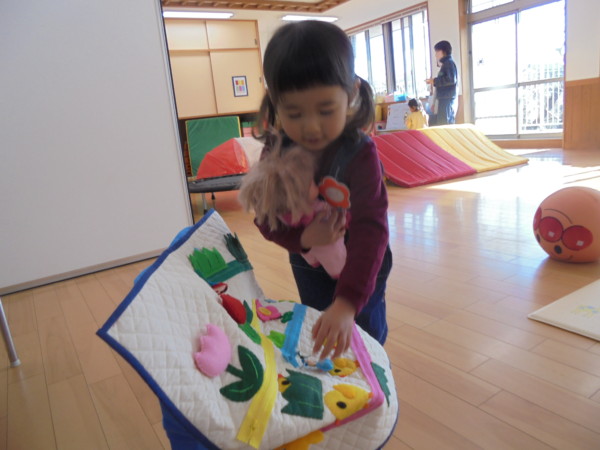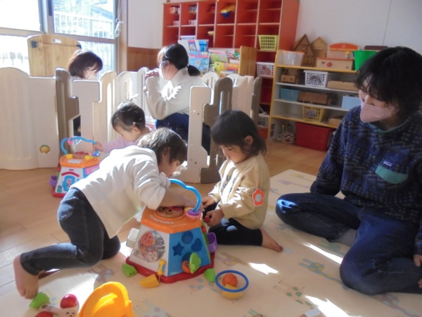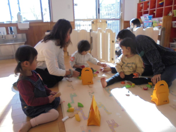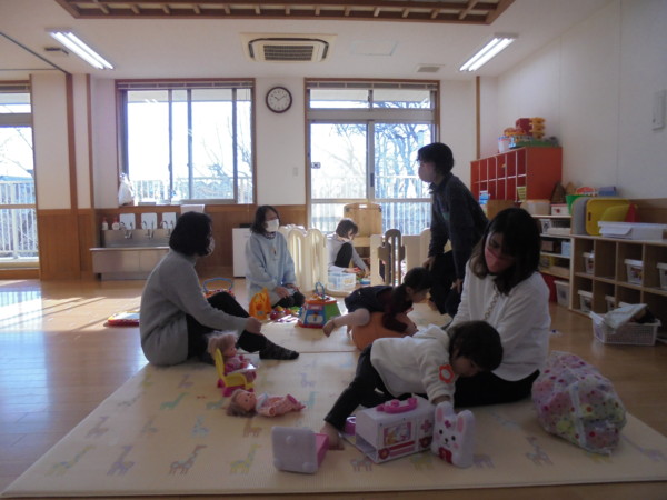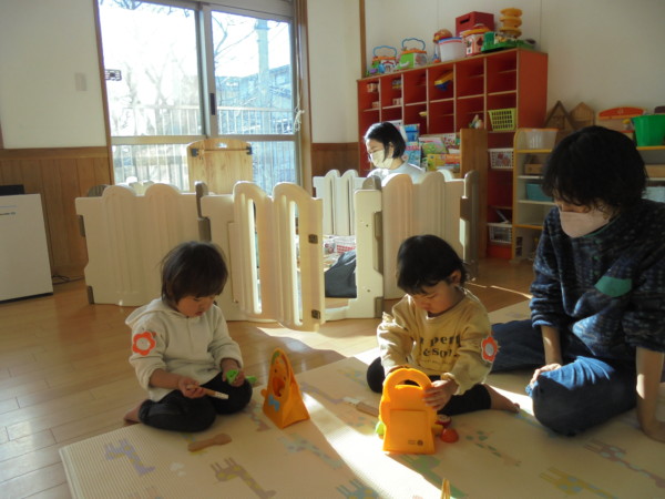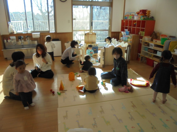 「やったー!保育園の中に入れる~楽しみだな~ワクワク」そんなみんなの声が聞こえてきそうな園舎開放が始まりました。新しいおもちゃも増えて、みんなのことを待っていた多目的ホール。それぞれ好みのおもちゃを見つけて、目を輝かせて遊んでいます。そんなこどもたちを見つめているお母さま方の笑顔が印象的でした。1時間があっという間に過ぎ、最後のお楽しみもしっかり見られる様になりました。おにのパンツの歌も直ぐ覚えてしまい、みんなすごいね!またあそびましょう!