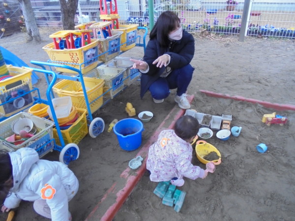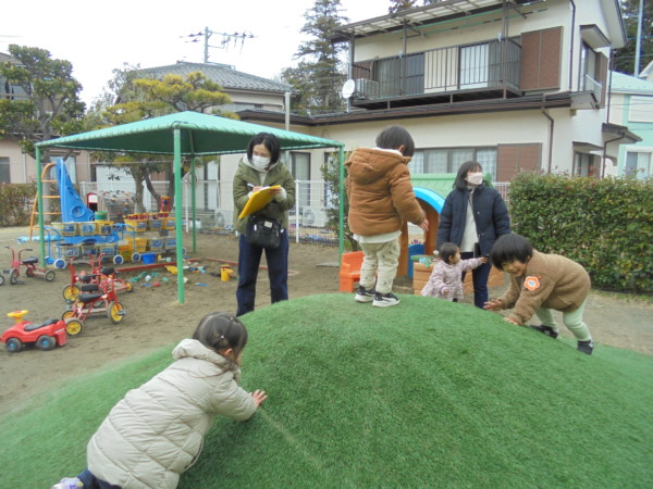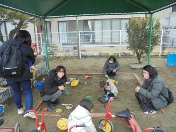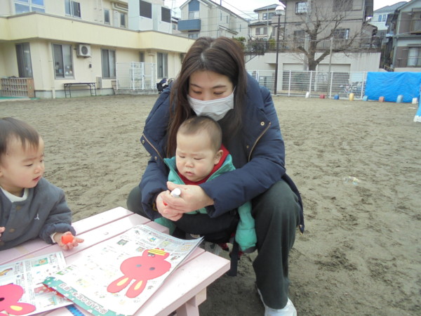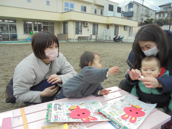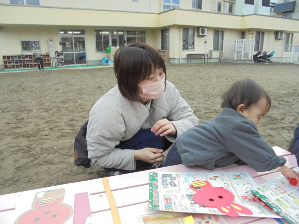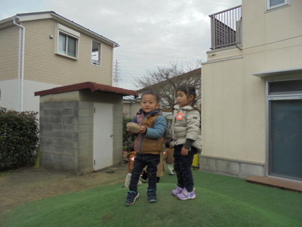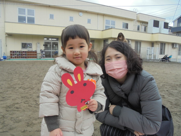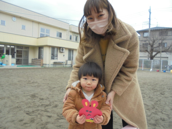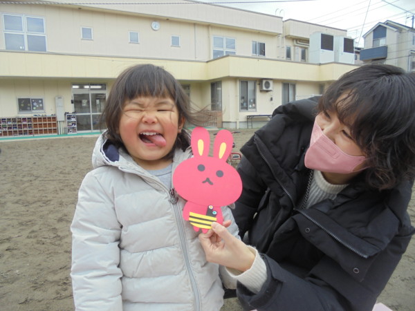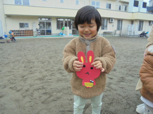 太陽がかくれんぼ。園庭がとっても寒かったね。今日は、うさ鬼ちゃんを作りました。思い思いの可愛いうさちゃん。節分までおうちのお部屋に飾っておいてね!鬼のパンツの歌もしっかり歌えるようになったね。節分が楽しみです。芝山では、こどもたちと園長先生の笑い声、とっても楽しそうでした。
