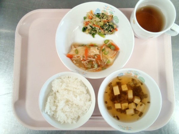 ご飯、お吸い物、魚の野菜あんかけ、ごま味噌和え・・・318kcal