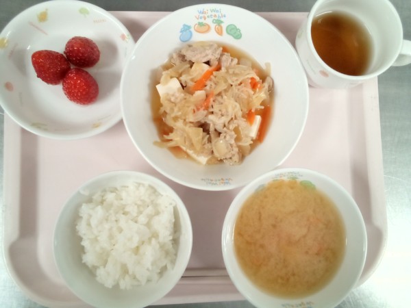 ご飯、味噌汁、肉豆腐、いちご・・・366kcal