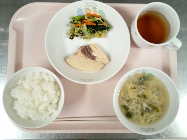 ご飯、コーンスープ、魚の味噌煮、青菜のごま和え・・・343kcal