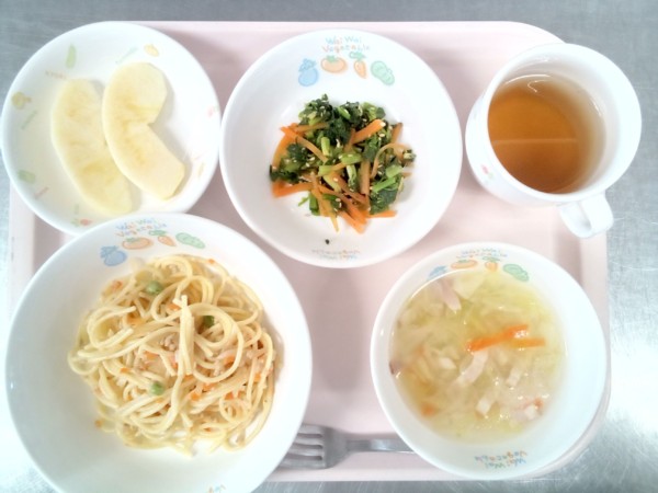 肉みそスパゲティ、ジュリエンヌスープ、ごま和え、リンゴ・・・265kcal