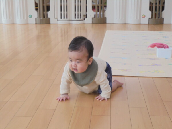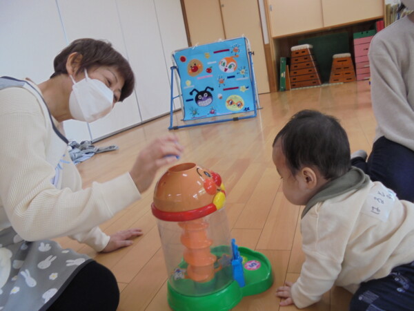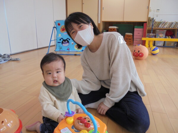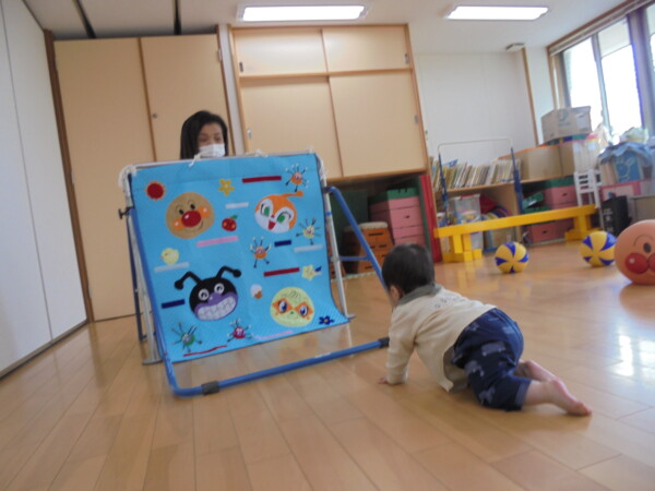 今日は一組のお友だち。初めて体験することばかりで不安そうな表情。ママから離れず、周りをキョロキョロ・・曲に合わせてタオル遊び、おもちゃ遊びをしている内にハイハイで動き出し「ぼく、できるよハイハイ♪」少しずつ場所に慣れてきた様子で笑顔も見られます。