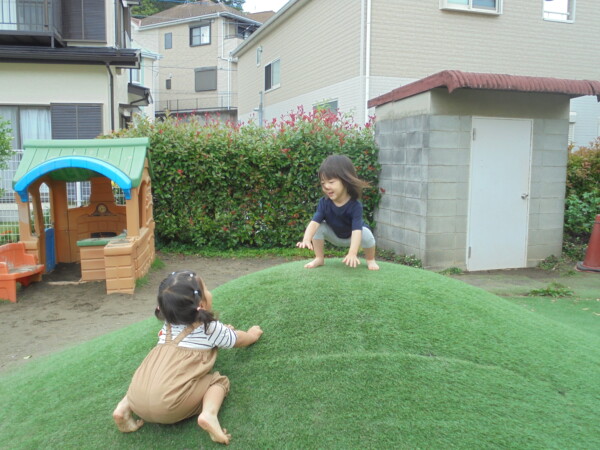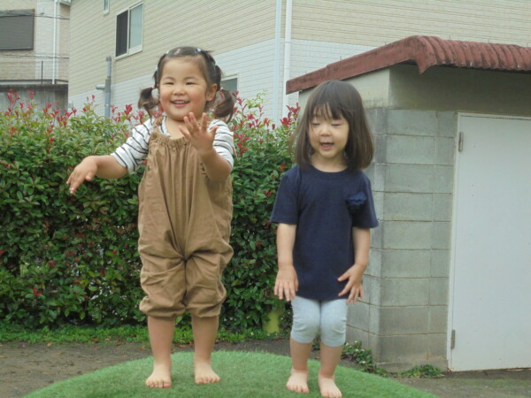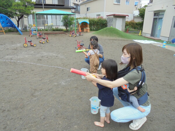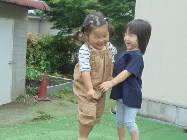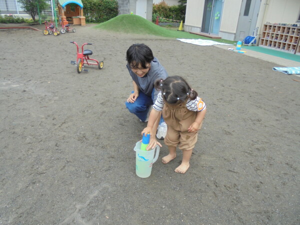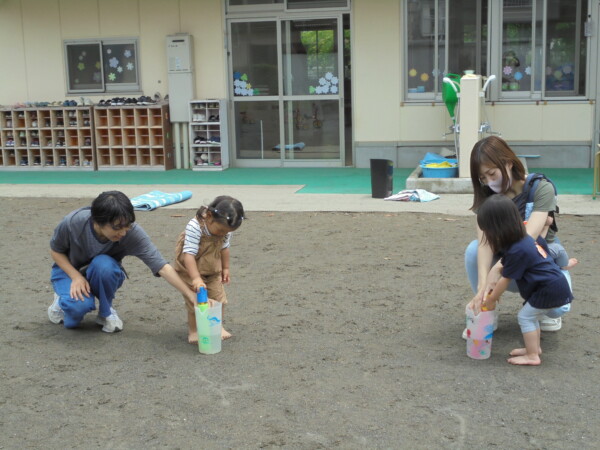 天気がはっきりしない毎日が続いています。体調は崩していませんか。今日は二組のお友だち。裸足で遊びました。2歳になると遊びにも変化が見られお友だちを誘ったり、共通の話題で行動ができたり子どもたちの成長が見られる1日でした。水遊びは楽しいね。シャボン玉も登場。水鉄砲は上手に打つことが出来て、先生が的になりビショビショになり大喜びでした。「たのしかったね~」一番の笑顔でした。これから水遊びが多くなります。汚れてもいい服装で来てくださいね。水分補給も忘れずに。