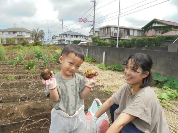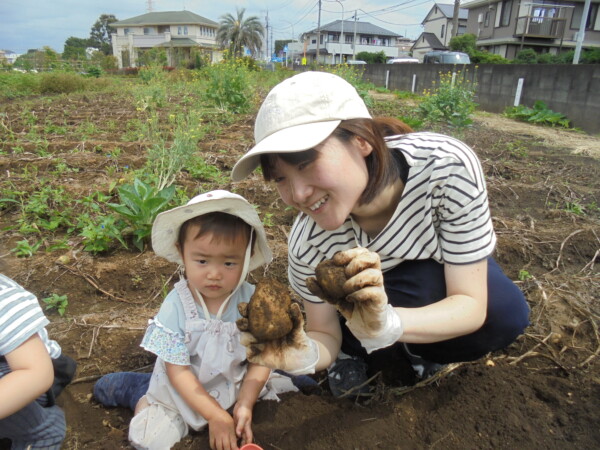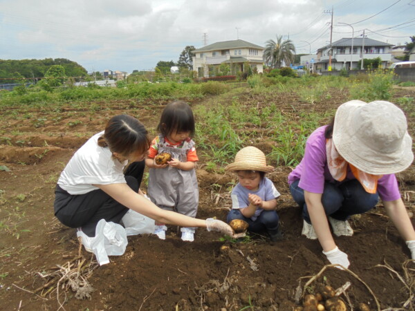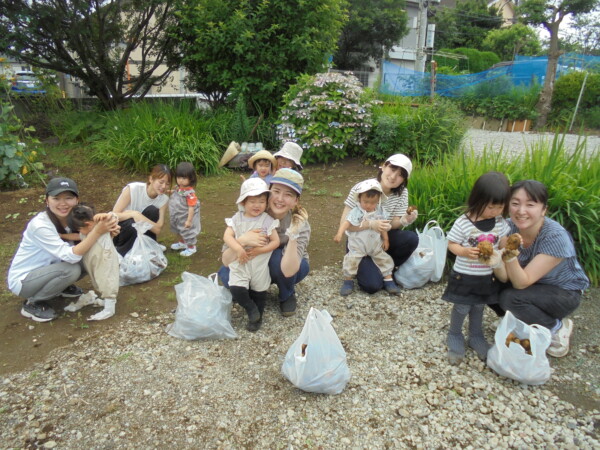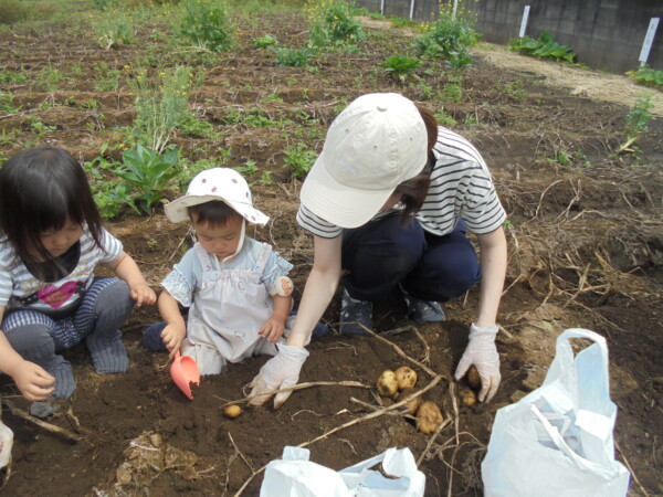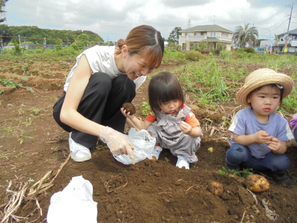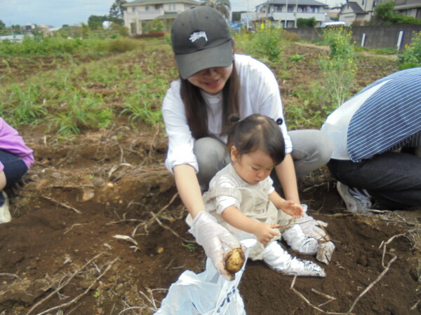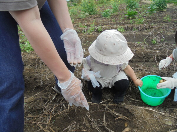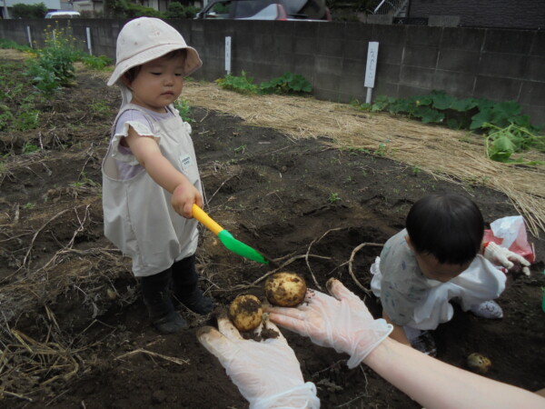 昨日、天候不順で中止となったじゃがいも堀り。今日も少し心配は残りましたが無事にじゃがいも堀りを行うことが出来ました!土の中からゴロゴロ飛び出すじゃがいもさん♪お芋を見つけるより土いっぱい遊ぶ事ができて、初めてのじゃがいも掘り大成功です!お家ではじゃがいもを洗って「土のお洋服がとれたね!」はいかがでしょうか?今日の食卓には、カレーかな?バター焼きかな?またお話し聞かせてね♡