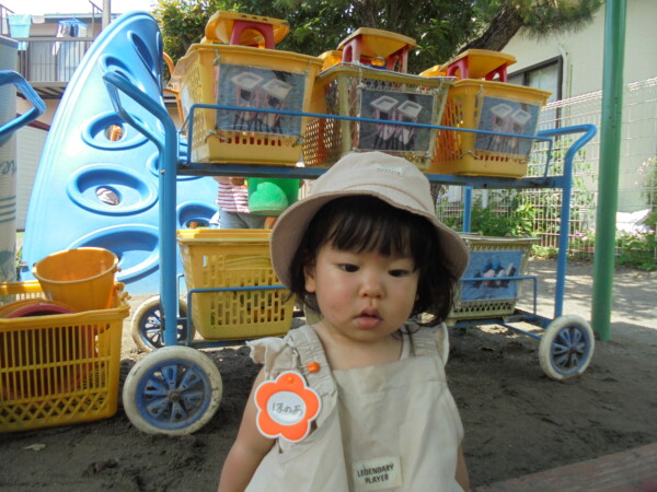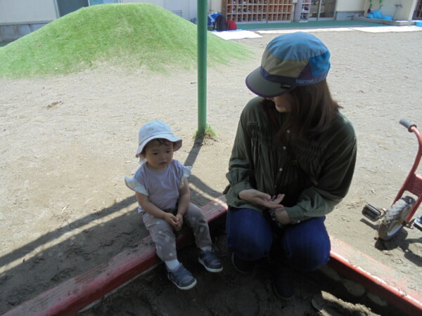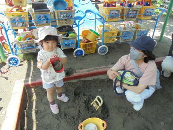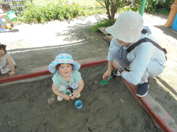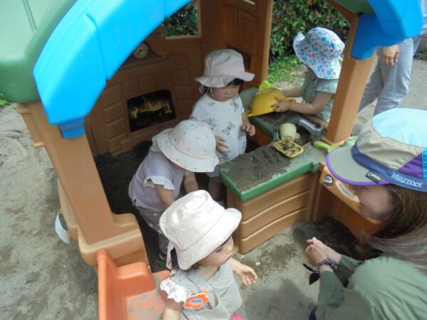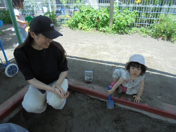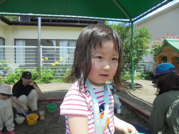 梅雨空が一転、暑いぐらいの陽気になりました。日陰を求めて、みんなで砂場の中で遊びました。みんなで砂遊び、楽しかったね♪お楽しみの時間も砂場の中で!地震の絵本を見ました。みんなにはちょっと難しかったかな?でもいつ起こるか分からない、地震。みんなで気を付けようね!