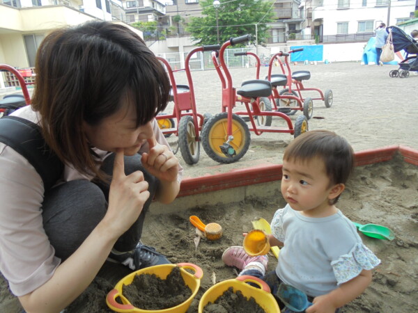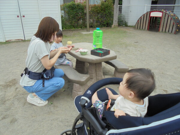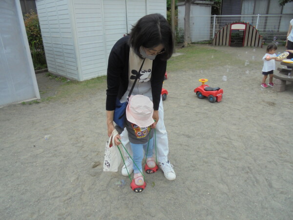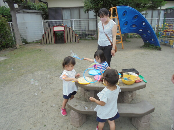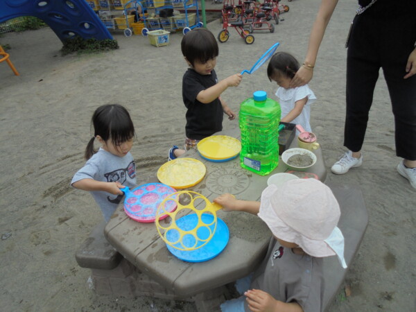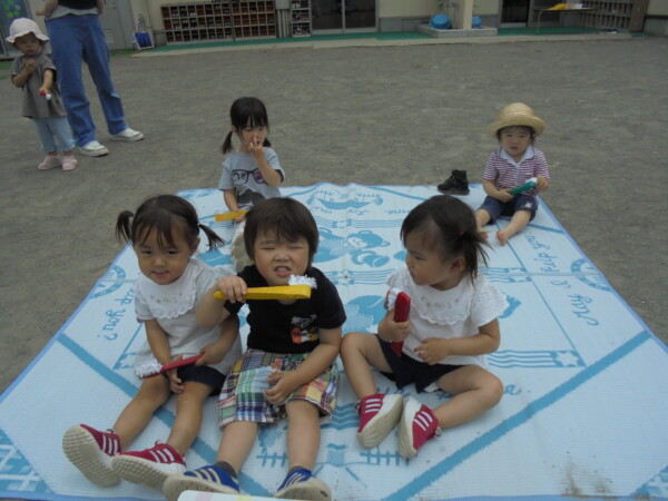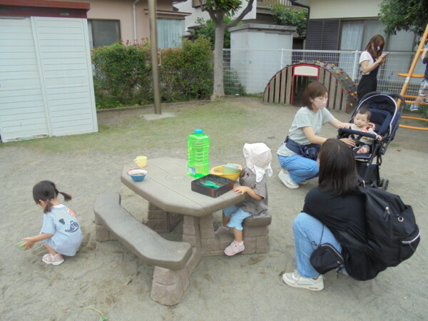 今日はシャボン玉遊びを中心に砂場で遊んだりかけっこをしたり、歯科予防週間にちなんで大きな歯ブラシを使って歯みがきの練習もしました。お土産で持って帰った歯ブラシで家でも練習してね。ぬいぐるみで歯医者さん遊びも楽しいね。はっきりしないお天気が続いています。体調を崩すお友だちもいます。気を付けて下さいね。新しいお友だちも参加、どんどんお友だちが増えると楽し~な♡