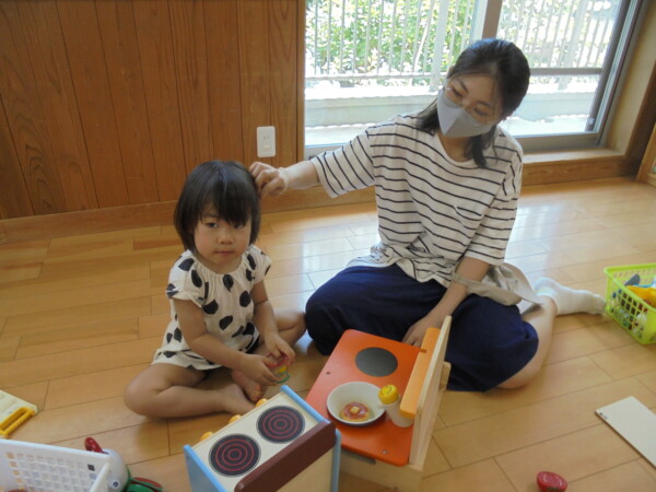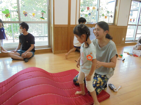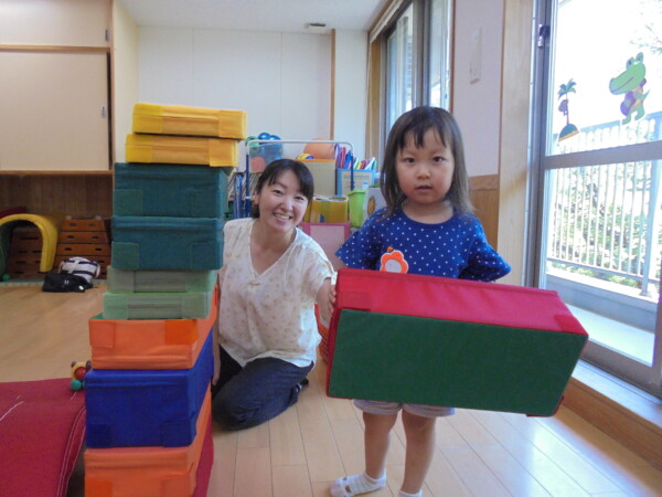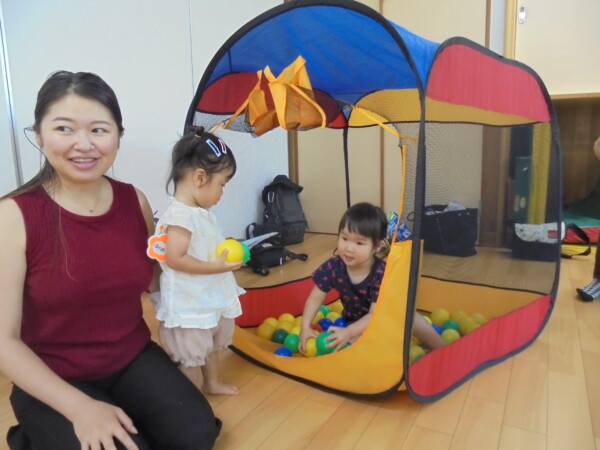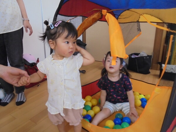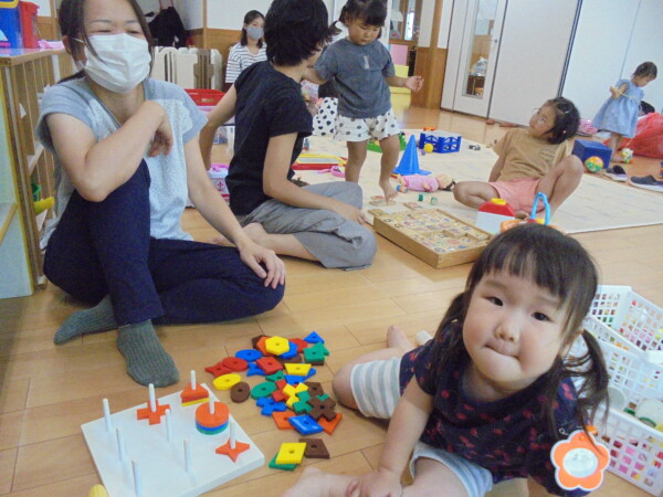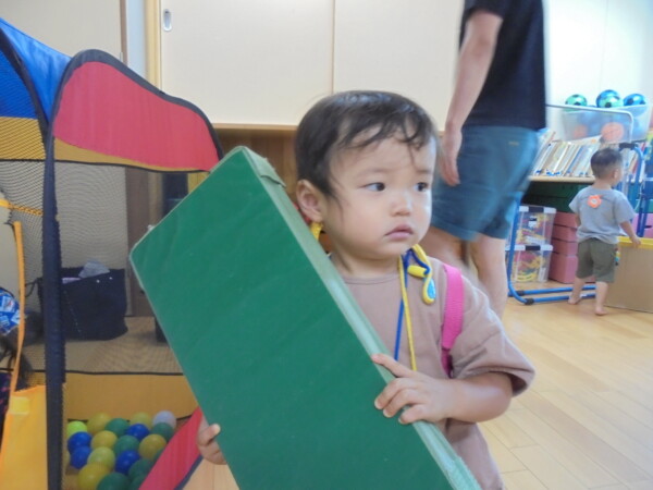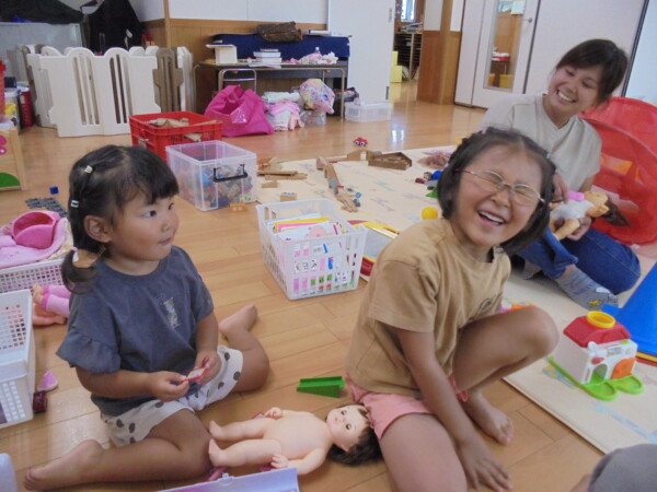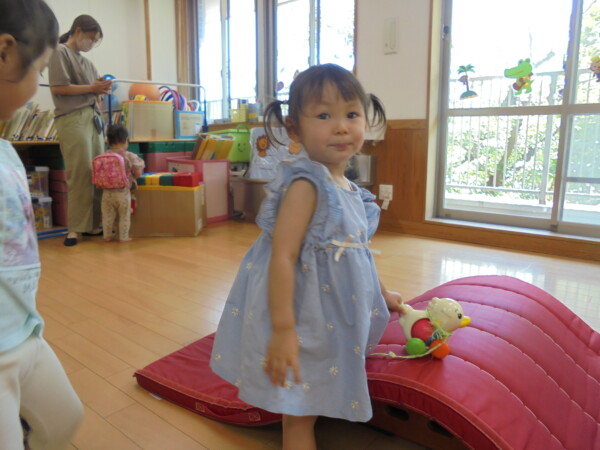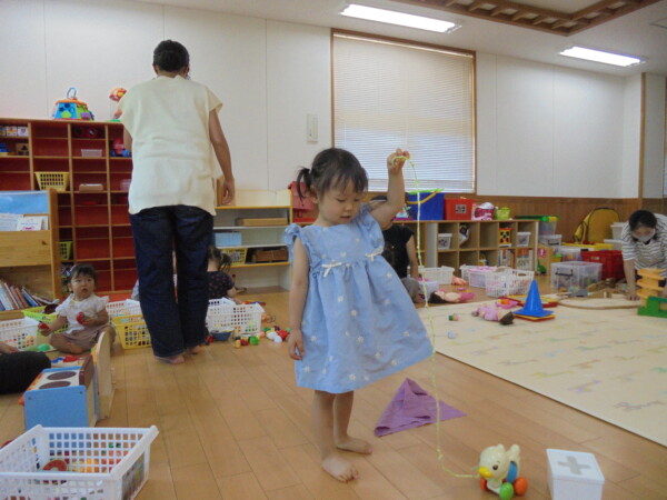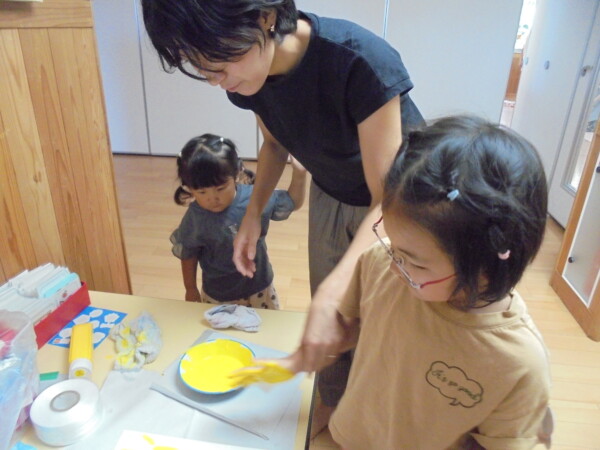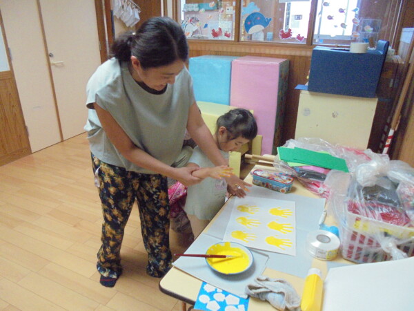 暑さのため、室内に変更。幼稚園もお休みになったので多目的ホールが狭く感じるくらいのお友だちが遊びにきてくれました。みんな大きくなっていて、元気百倍では足りません。二百倍かな・・小さなお友だちはその動きにビックリしたり仲間に入ったり、異年齢交流も楽しい場所になるように勧めていきたいと思います。先日作った手型ひまわりが出来上がり「すてき」ですね、の声に今日のお友だちたちも予定を変更して、ひまわりを作りました。元気いっぱの開放日でした。