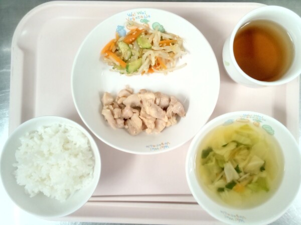 ごはん、えのきのスープ、鶏のマーマレード煮、もやしのごま和え・・・314kcal