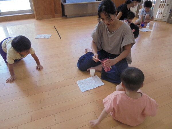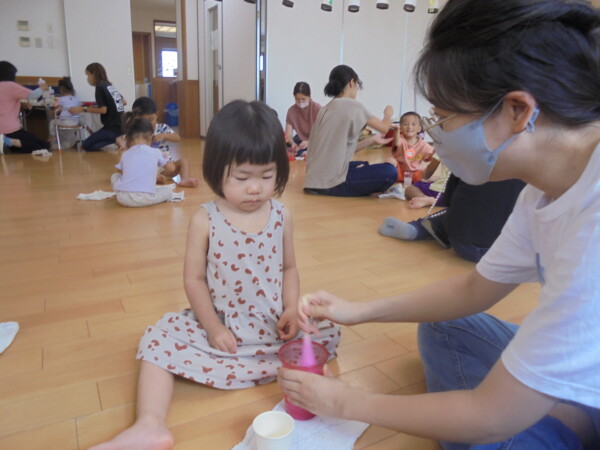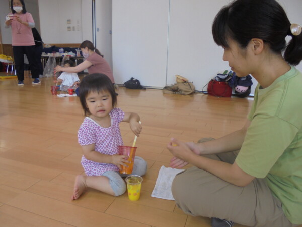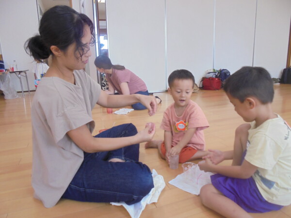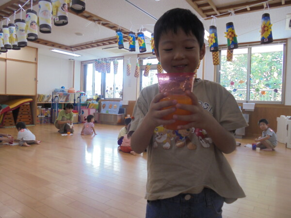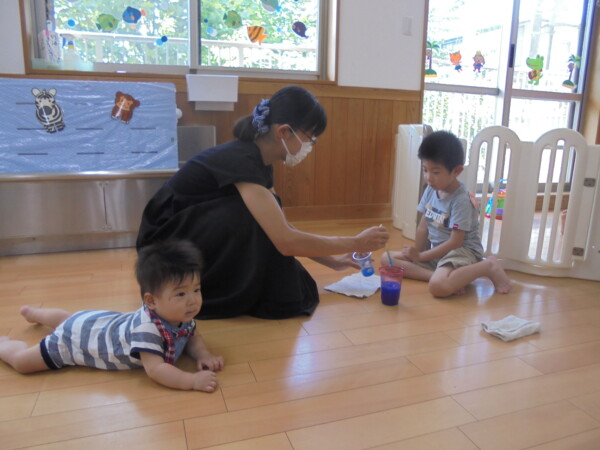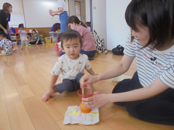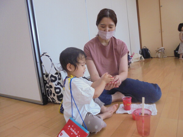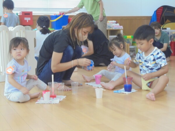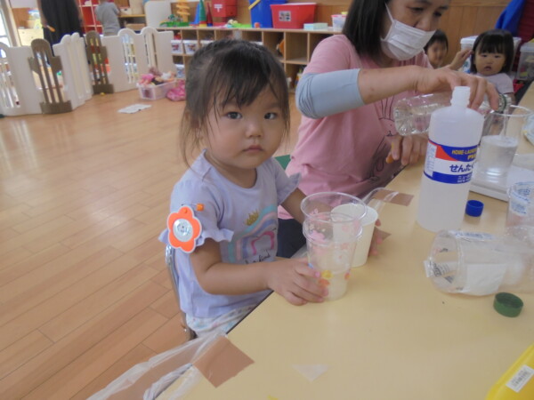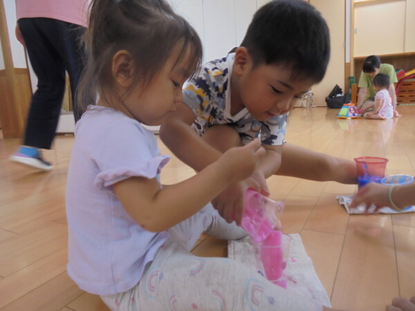 今日はスライム作り、楽しんでいただけましたか?ビローンと伸びておててにピチャっとくっついて、触るのちょっと心配して「おっかな~いな」手が少し伸びたり縮んだりしているお友だちもいました。少し冷たくて色々ないろに変身するスライム。「全部の絵の具をまぜたらどんなになるかな?」「あっ、ちゃいろ、むらさきかな」気づき大切ですね。小さなお友だちは少ししか遊べなかったね。ごめんなさい。今度は小麦粉粘土にチャレンジしようね。台風も近づいて心配ですが、体調を崩さないように気を付けてくだいね。
