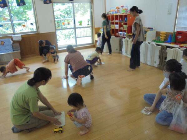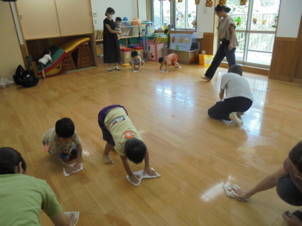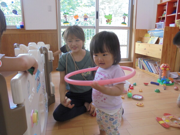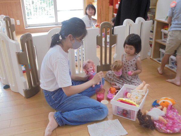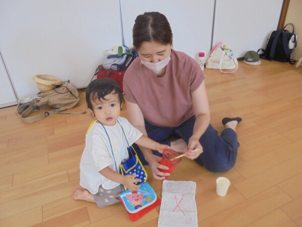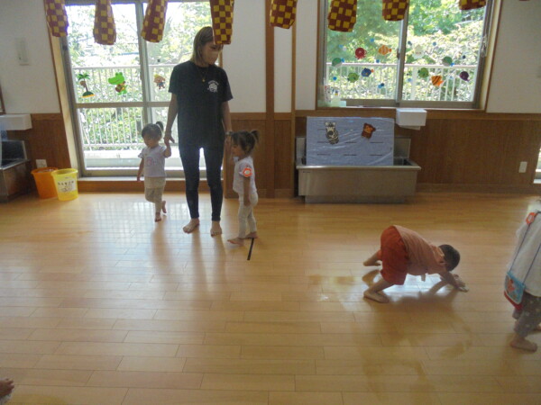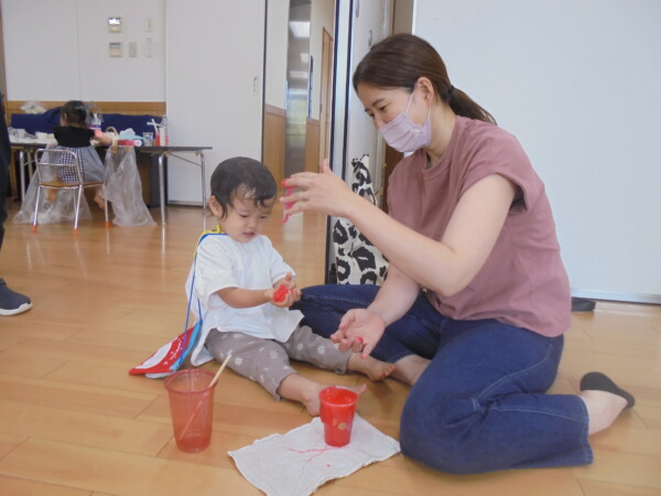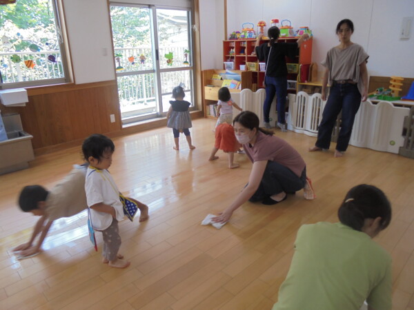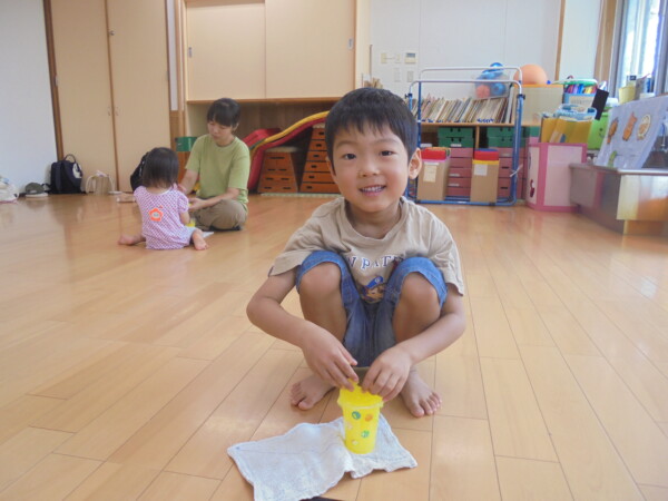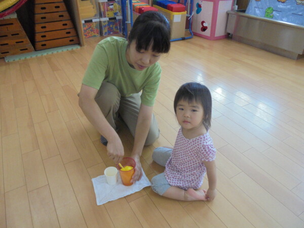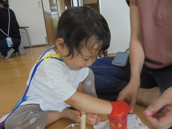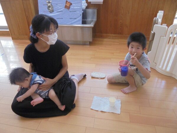 今日はスライム作り、楽しんでいただけましたか?ビローンと伸びておててにピチャっとくっついて、触るのちょっと心配して「おっかな~いな」手が少し伸びたり縮んだりしているお友だちもいました。少し冷たくて色々ないろに変身するスライム。「全部の絵の具をまぜたらどんなになるかな?」「あっ、ちゃいろ、むらさきかな」気づき大切ですね。小さなお友だちは少ししか遊べなかったね。ごめんなさい。今度は小麦粉粘土にチャレンジしようね。台風も近づいて心配ですが、体調を崩さないように気を付けてくだいね。
