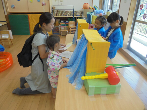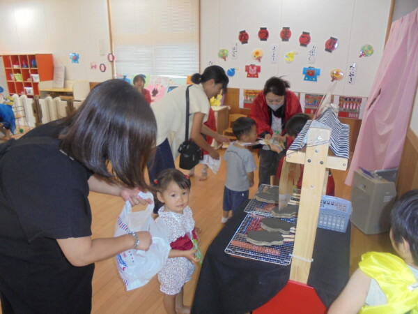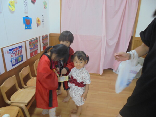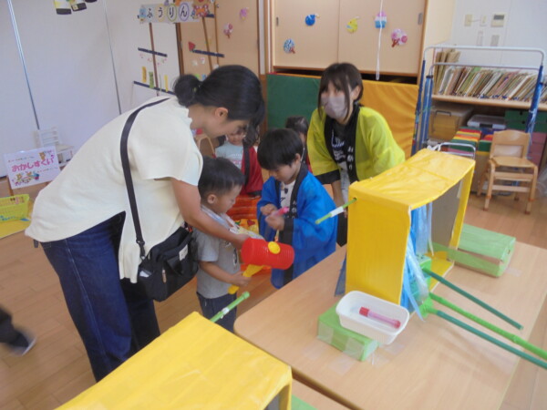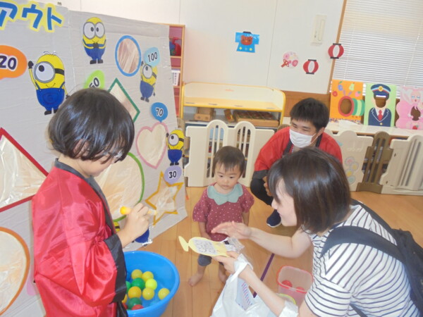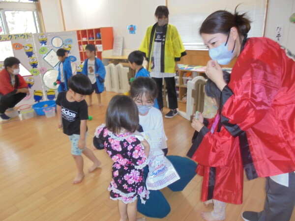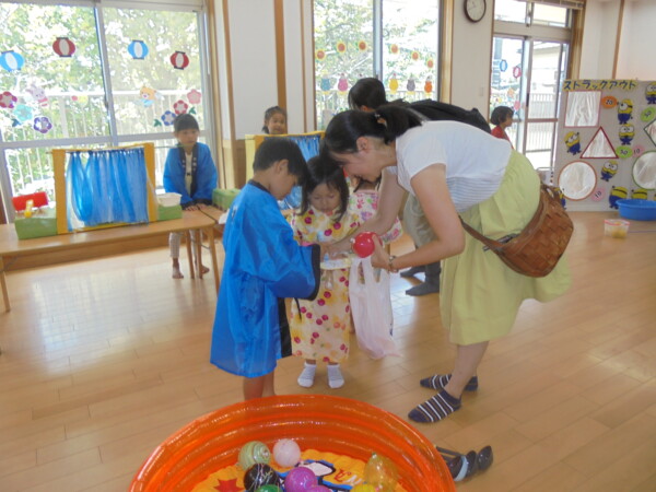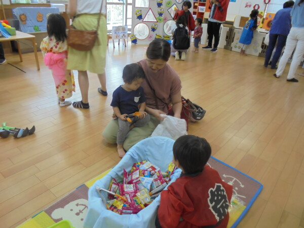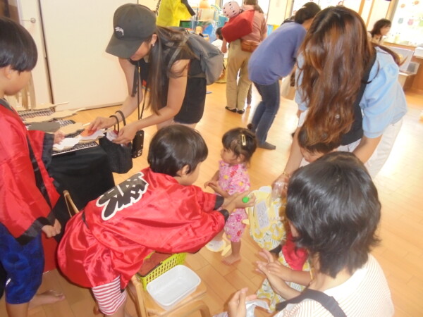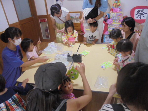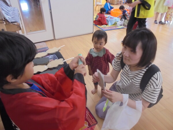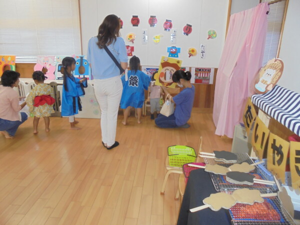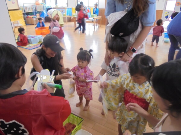 今日は夏祭り。久しぶりに保育園のこどもたちとキッズ、地域のおともだちが交流をしながら行事を楽しむことが出来ました。子どもたちのお店屋さん、元気があって「いらっしゃいませ~いらっしゃいませ~」の掛け声に地域のお友だちも、ちょっとびっくりしていましたがすぐに、ニコニコ笑顔♡。ヨーヨー・たい焼き・ストラックアウト・お菓子すくい・まだまだいっぱいいあったね。さくら組さんが作ったお化け屋敷も、力作で楽しんでもらえたと思います。とってもとっても、素敵な夏祭りでした。